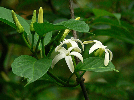 特長 | 暖地の海岸近くの山林内に生えるつる性の常緑多年草。葉は対生し柄があって卵形または円形、全緑で厚みがある。花は白色で芳香がある。 |