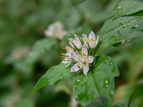 特長 | 深山に生える1〜2年草。高さ30〜40cmになる。茎葉は卵状楕円形、先は尖る。葉頂および葉腋に白色の花をつける。花冠は直径1.5〜2cm、5深裂するが、裂片は完全に開かない |