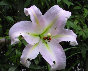 先週、ヘンガーデンにひょっこりユリが咲きました。何とも珍しいヤマユリとササユリの混血雑種のようなユリです。