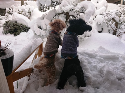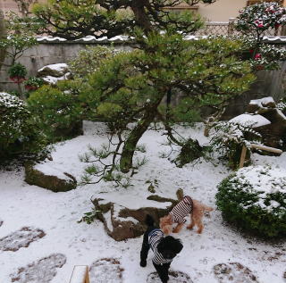 朝「ふく」と「そら」を庭に出してやる時「そら」は雪が初めてだったみたいでしばらくデッキの上で立ち止まって考えていました。