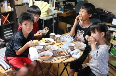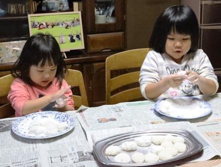 2人は楽しそうに餅を丸め、出来た餅にきなこに付けて美味しいと言って食べていました。