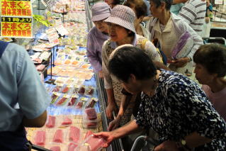 解体販売はお客様と一緒になって楽しむ時間でもあり頭、カマ、中オチの販売ではじゃんけんで買って貰うお客様を決定しました。