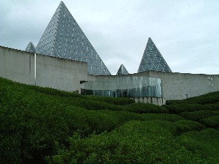 写真は仁摩サンドミュージアムの外観です。三角の建物が国道脇の丘の上にそびえたっています。
