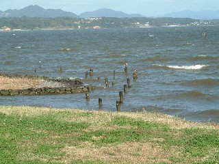 写真はゴビウスの近くで撮った宍道湖です。杭の上に鳥が止まっていました。