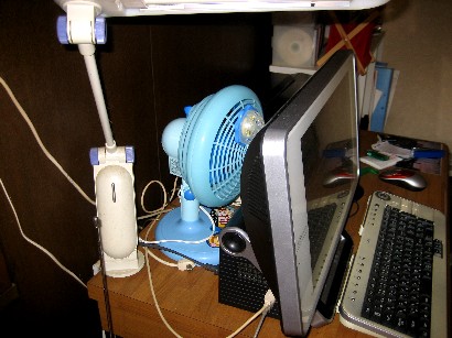 ハードデスクの温度が上がるためみたいなので写真のように裏から扇風機で風を送っています。