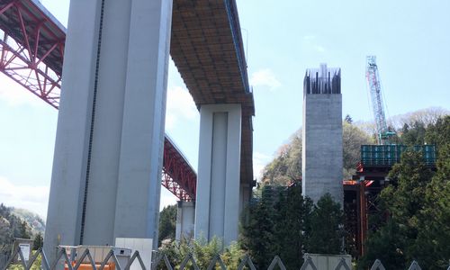 資材を運ぶのも大変そうな急こう配の斜面で、太く高さのある橋脚の工事が行われているのを見ると、最初から広い道路にしておけばよかったのにと思ってしまいます。