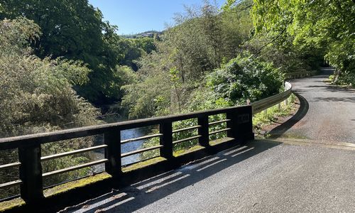 名倉交差点で国道20号から別れ、樹木に覆われた急な下り坂を進み、下り終えたところで境沢を渡ります。 字のごとく相模(神奈川県)と甲斐(山梨県)の県境を流れる川で、少し下流でダムによって水を満々と湛えた相模川に合流します。 境沢は両側から樹木に覆われ、この時期は藤の花が木に絡みついていました。