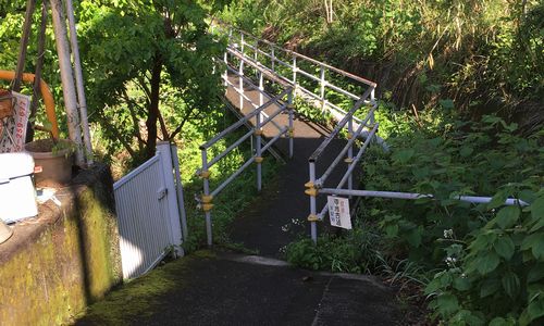 しばらくは両側に住宅が並ぶ舗装された道ですが、単管パイプの手摺が付いた狭い橋を渡ると登山道のような未舗装の道になります。