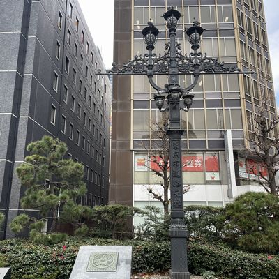日本橋の真ん中に立っていた道路の起点を示す道路元標は、路面電車の架線を吊るす必要がなくなり橋の袂に移転しました。