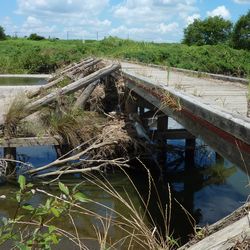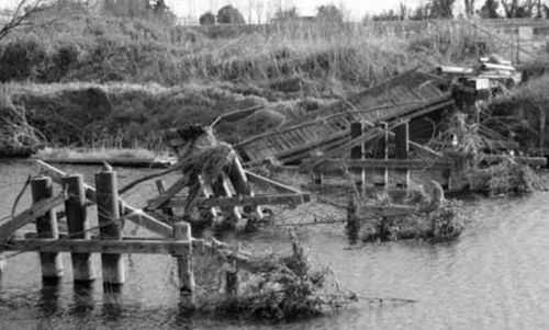 先代の橋と現在の橋はほぼ同じ形状で、橋桁の鋼材による補強も同じですが、先代の橋は1995(H7)年度に架け替えられた橋で、洪水に襲われた時は20年近く経過していました。