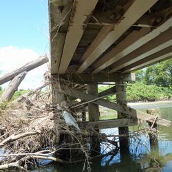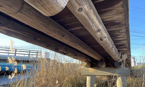橋面と橋脚はコンクリート製ですが、よく見ると橋桁は太い材木が使われていて、橋脚部分は橋桁を支えるため木材が二段に使われています。橋面はコンクリートが打ってありますがその下の床板には木の板が並べられています。コンクリートは橋面を滑らかにし耐久性を高めるためにあるようです。