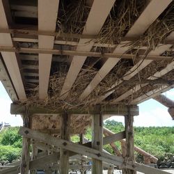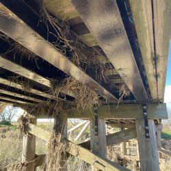 下から見ると、丸太の橋桁に渡した木の板が橋面を作り出しているのがわかります。少々雑な作りですが、人が渡るだけの橋なのでこれで十分です。橋脚がコンクリートなので木橋とは言えないかもしれませんが、島田橋が木橋と言えるなら、この無名橋も立派な木橋と言えます。
