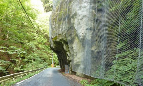 岩壁のほとんどはロックネットといわれる金網が張られているため、山間の道を走っているというより金網の中を走っているような感じになります。このネットは落石の発生を抑えるのではなく、小さな落石が道路に飛び出すのを防ぐ効果しかなく、ネットの下から落石がはみ出していることもあるので、走行時は要注意です。
