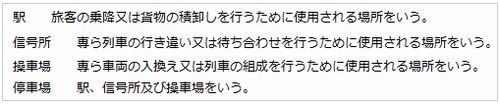 ところが、鉄道営業法に基づき定められた『鉄道に関する技術上の基準を定める省令』の第二条によると、”駅”は”停車場”に包含される施設であり、同じものではないことが分かります。