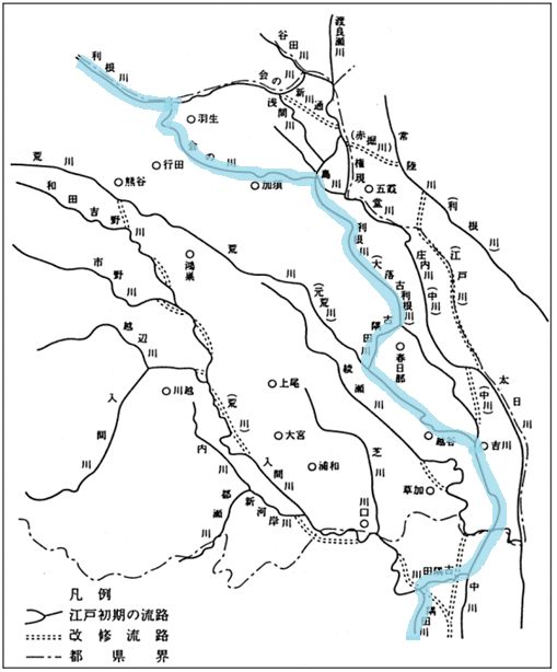 「大落古利根川」は昔の利根川の流れで、春日部市内で古隅田川に流れ込み、岩槻区で現在の元荒川を流れ吉川市で大落古利根川に戻り、都内では古隅田川(現在は河川として存在しない)を流れ、隅田川につながっていました。