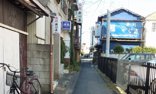 写真手前の丸窓がある建物は寿司屋で、その隣はスナックでしたが現在は戸建て住宅になっています。顔を赤らめた旦那衆が千鳥足で歩く横丁という雰囲気はありません。