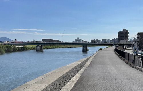 現在の狩野川は、これまでの洪水被害もあり高い堤防が築かれていますが、江戸時代に沼津宿があった付近はもともと高台なので堤防はありません。