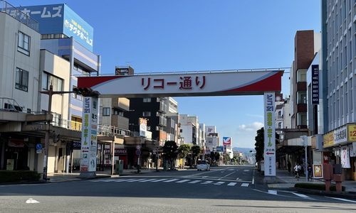戦後に発展した駅の北側には、「リコー通り」という企業名を掲げたゲートが道路をまたいでいます。