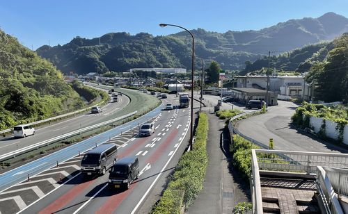 近くを流れる丸子川を渡りしばらく進むと、高速道路のような国道1号岡部バイパスにぶつかります。