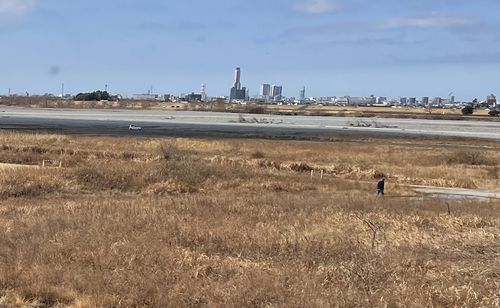 浜松市街は天竜川の河岸段丘上に広がっていたので、刈入れの終わった田んぼの先に見えたのかもしれません。