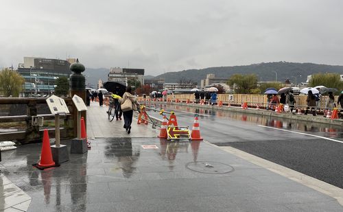 京都三条大橋は高欄だけが木製の橋で、到着したときは工事中でした。