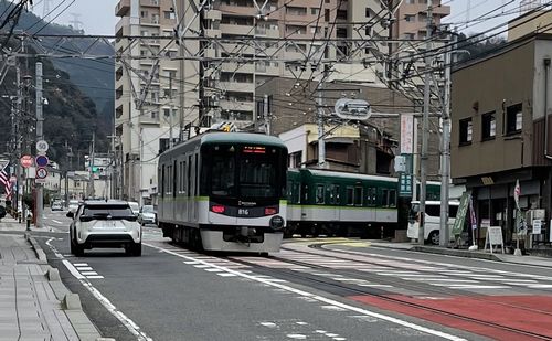 大津市内には、京阪京津線が一般の自動車と一緒に路面を走る区間が残っていて、信号を守り自動車の間を徐行しながら走っている姿を見ることができます。