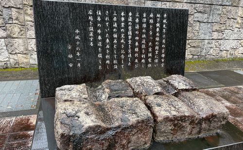 敷き詰められた石は「車石」と呼ばれ、車輪が通った部分がすり減って凹んだ形になっています。国道拡幅の記念に造られたミニ公園で「車石」を見ることができます。