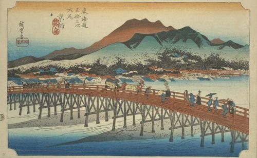 三条大橋の上は、旅人の一群のほか、荷を担ぐ人足、笠を持たせ歩く女性、橋の上から川を眺める人など多彩な人々が描かれています。
