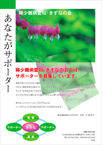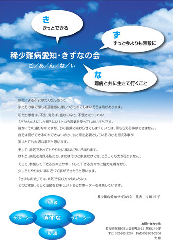眠ってしまって何が心配かというと点滴の見張り。 仕事第一でボランティアもしたい。ボランティアしたいので仕事はする。私の中の循環の図があります。 先月発足した「稀少難病愛知・きずなの会」ご案内、入会申し込み書、パンフレットが出来上がりました。