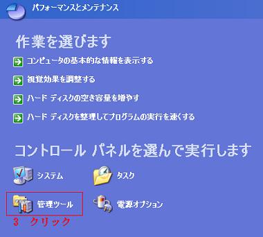 スタートメニューから「1.コントロールパネル」をクリック→「2.パフォーマンスとメンテナンス」をクリック→「3.管理ツール」をダブルクリック→