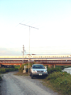 | 安城、刈谷とおまけ移動をやって帰ろうと思ったのです が、大府市のリクエストがあったため日没まで少し時間 があるので再度大府市でアンテナをあげました。 場所は新幹線のすぐ近くの低い堤防の上です。 新幹線が通るたびにすごいノイズですが、それを 我慢すれば何とか運用できました。 最後に倉敷のJA4RF局にバックから呼ばれたのには 驚きました。 日没となったためこの後撤収して一路帰宅しました。 新幹線が通るタイミングを見計らって撮影→ |