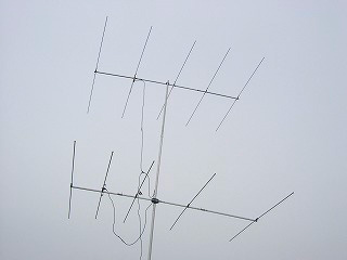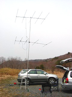 | JA6MBY局の神埼市移動の迎撃のため豊能郡 能勢町に行きました。 当初同じ豊能郡の豊能町で待ち構えていたの ですが、どうしても取れず、急きょ場所変えする ことにしました。 初めはアンテナ1本だけで聞いていましたが厳し いためJA3BXC局の発案でスタックにしました。 写真を見ておかしいと思われますでしょうか。 そうです上と下のエレメント数は同じですが、 まったく違うアンテナです。 上が当局の自作5エレ八木、下がJA3BXC局の 5エレF9FTです。 マッチングもガンママッチとTマッチで違うのです が何とかなるだろうかということで実験をかねて 試してみました。 |