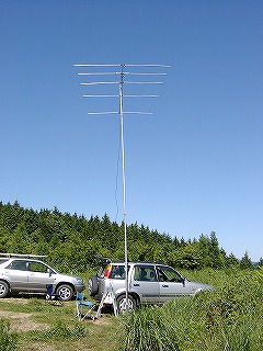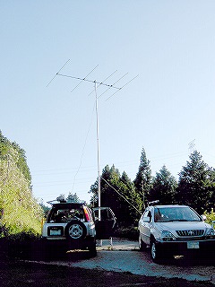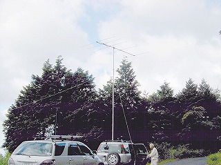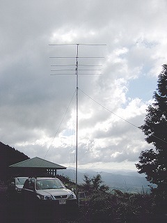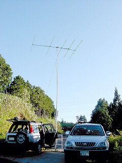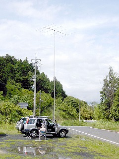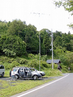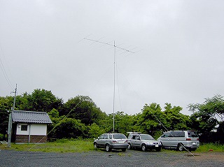| 両山寺の西側駐車上で7エレをあげました。 雨はしばらくすると止みましたが、コンディシ ョンはどん底。 広い場所でのびのび出来るのですが呼ばれ ないため場所変えすることにあいなりました。 ここでブームを引っ張り上げるポールを置き 忘れてしまいました。 |