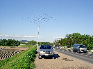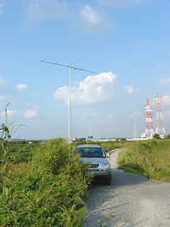 ←写真の方向が3エリアで、飛びそうなのです がモービルホイップでは苦しい。 5エレのお手軽八木アンテナを揚げると 599/599で楽勝。 |