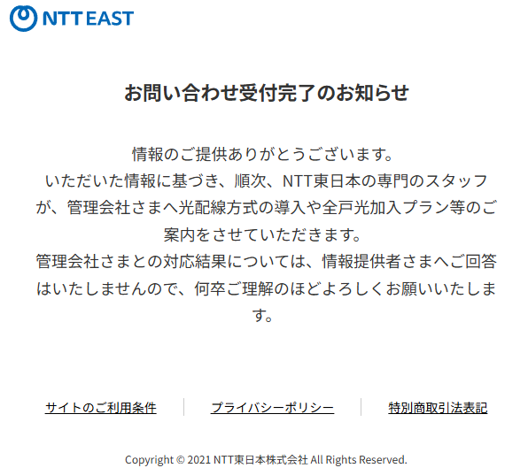 そうそう、NTT東日本の例のページから管理会社に、光配線方式導入を検討しろっていうやつを出してみた。