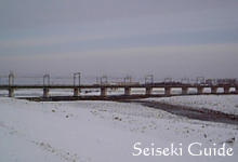 朝焼けを背景にしたかったのですが、デジカメの調子が悪いのか腕が悪いのか、光量をうまく調整できなかったので、鉄橋をくぐって反対側から撮りました。