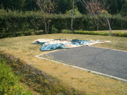 撤収の様子です。思いっきり広げています。撤収を始めた頃から風が吹き始めたので、乾きも早いです。優花はペグを拭いてくれています。