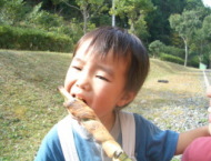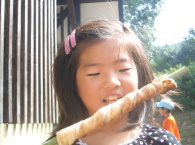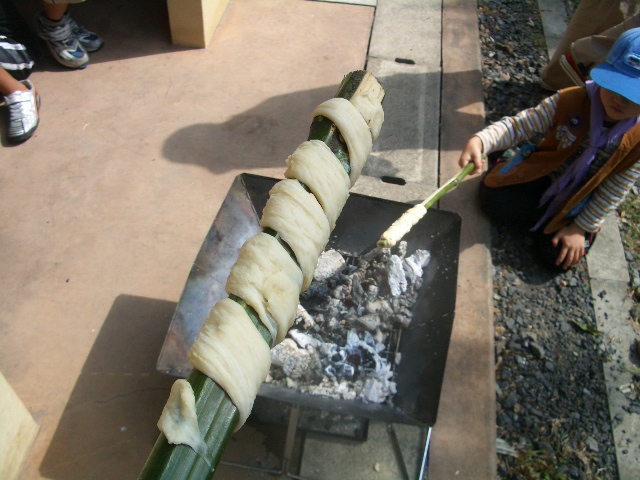 竹にパンの生地を巻いて、炭で焼くのですが、これがまたとてもおいしい!恵士郎もかぶりついてます。竹が熱いので気をつけないといけません。