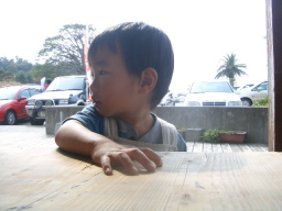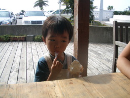 道の駅でアイス休憩です。ママが来るのを待っている恵士郎です。