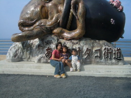 道の駅から歩道橋を渡って海側に下りると記念碑ができていました。去年の11月にできたようです。タコですが、ものすごいリアルで、ちょっと怖いです。それをバックに記念撮影です。