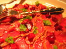 たまねぎの厚切りのピクルスしゃくしゃくで甘酸っぱくて美味しいの〜。写真の他に、揚げたての巨大にんにく&おじゃががほくほくでこれまた美味いのなんのって・・・!ああ〜お腹がすいてきた〜。