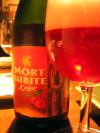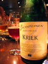 で、このビールはそのスカルベークを使った最高級のクリークです!ああ、また下戸がそんな素晴しいビールをいただいちゃっていいのかしら〜。例の如く高級ビールはボトルもシャンパン風な佇まい。