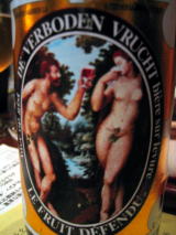 ラベルの絵も人気だそうです。さて、問題です(と、主催者様にクイズを出された)ラベルの元絵になったルーベンスの「楽園のアダムとイヴ」ではアダムは手に何を持っているでしょう?→画像が見にくいですが、こちらのアダムとイヴさんは手にビールのグラスを持って一杯やってます(笑)