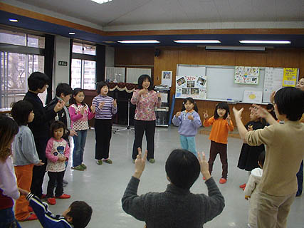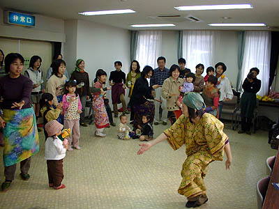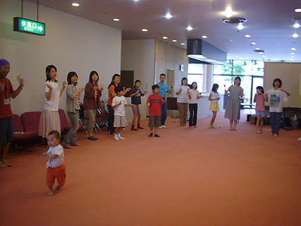 アフリカンダンスに挑戦!はなちゃんの動きに合わせようと真剣です。こどもは持参のおもちゃの太鼓をたたいてます。もちろんアフリカンリズムです。