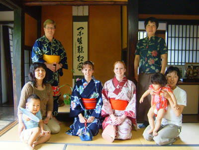 どうだん亭で浴衣体験、近くにステイしたダンサーの2人もいっしょにみんなで楽しみました。