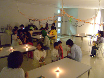 !」する夜道は暗くてキャンドルが灯ってます。お菓子はたくさんもらえたかな・・・?
