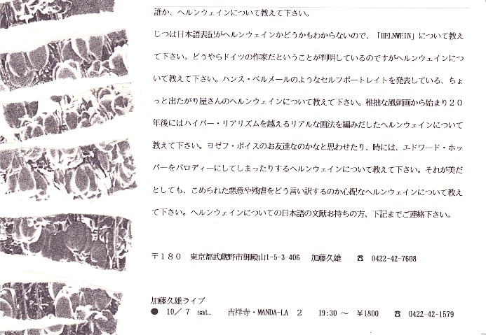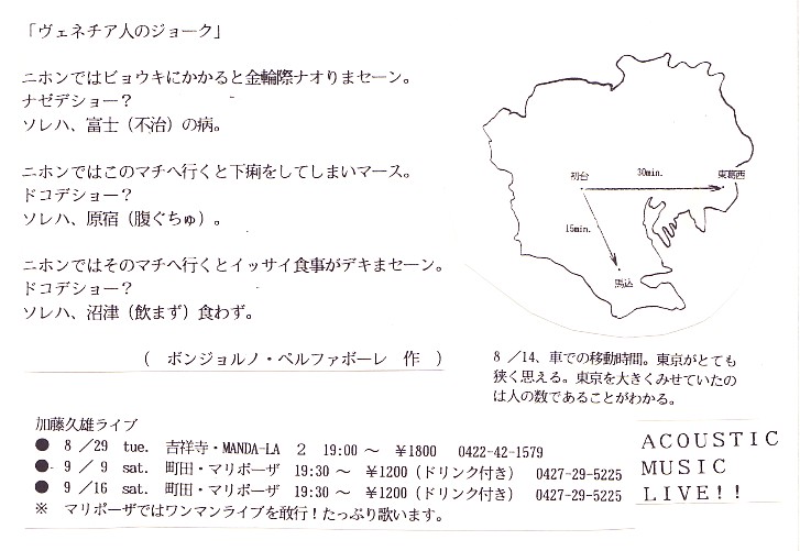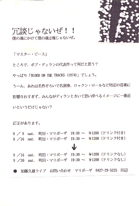 町田・マリポーザ 1. 地下街を通って 2. 君の胸で 3. カラスのブルース 4. GIBSON-J45 5. ばかやろう 6. 女性について 7. 休みの日 8. 懐かしい街のように 9. 夜更けのデニーズ 10. 回想 11. Sunday '95.9.30.sat. 町田・マリポーザ 1. Good Bye Girl 2. カラスのブルース 3. 構築の美 4. My Dear Life (W.sadao) 5. GIBSON J-45 6. 女性について 7. ウタの唄 8. 痛まない心 9. 夜更けのデニーズ 10. 彫刻家の死 11. 巨人の陥落 12. 地下街を通って 13. Sunday |