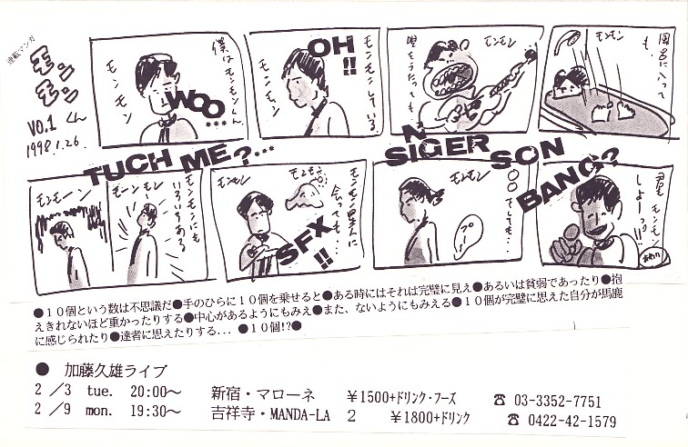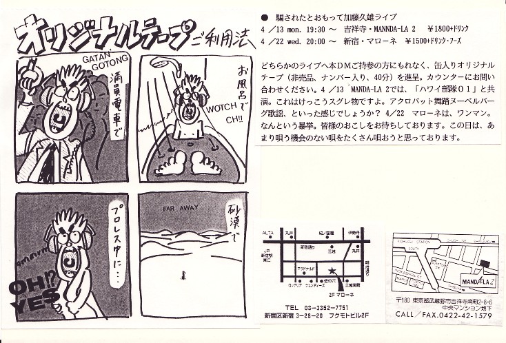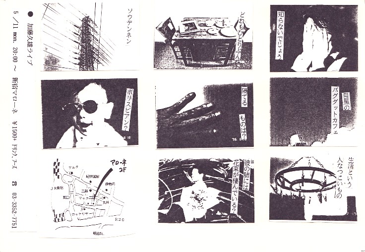 吉祥寺・MANDA-LA2 1. そばにおいでよ 2. 君の影、僕の灰 3. アプリコット・ハーブ 4. 痛まない心 5. 地下街を通って 6. 巨人の陥落 7. ああ美しき哉、世界は '98.4.22.wed. 新宿・マローネ 1. ラブソング(R.kagawa) 2. 君の影、僕の灰 3. 痛まない心 4. 巨人の陥落 5. 地下街を通って 6. 手に宿る死 7. 扇風機は、なぜ廻らないのか? 8. ああ美しき哉、世界は |