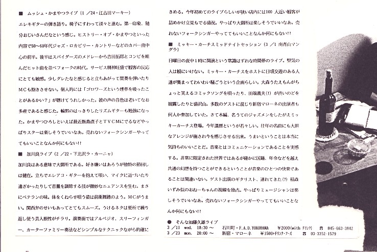 石川町・F.A.D.YOKOHAMA 1. 地下街を通って 2. カラスのブルース 3. アプリコット・ハーブ 4. 告別の唄 5. 巨人の陥落 6. 横浜散歩記 '98.3.11.wed. 石川町・F.A.D.YOKOHAMA 1. そばにおいでよ 2. カラスのブルース 3. 地下街を通って 4. 痛まない心 5. アプリコット・ハーブ 6. 癒着の理論 7. ああ美しき哉、世界は '98.3.23.mon. 新宿・マローネ 1. そばにおいでよ 2. カラスのブルース 3. アプリコット・ハーブ 4. 告別の唄 5. ああ美しき哉、世界は |