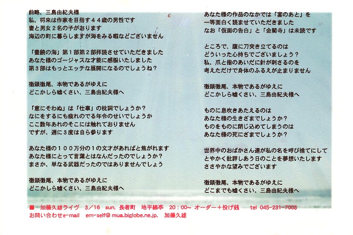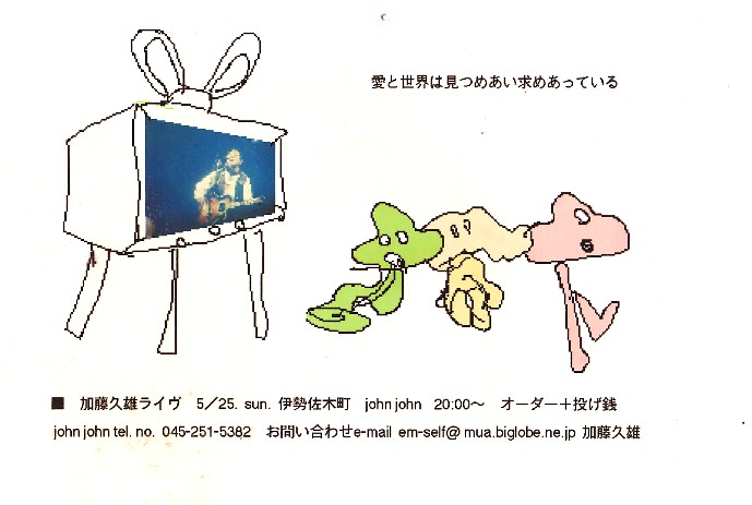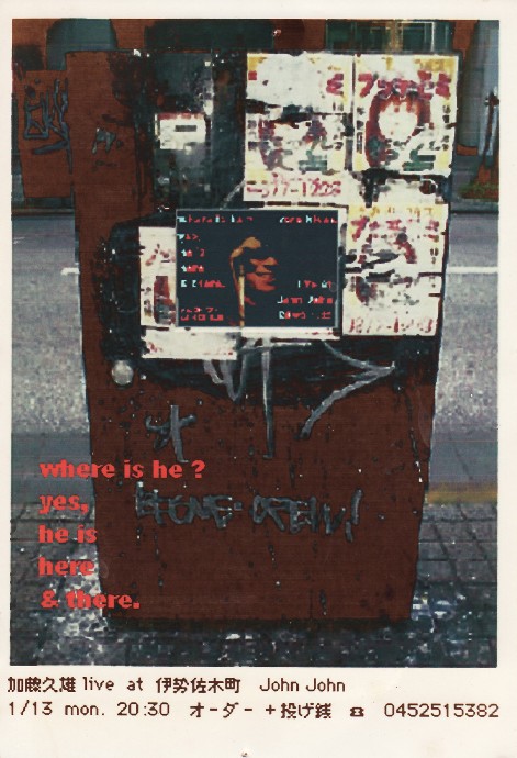 伊勢佐木町・John John 1st.stage 1. ニューミュージック 2. 売れないダンサーの物語 3. 君の影、僕の灰 4. Sound Of Silence 5. アプリコット・ハーブ 6. 地下街を通って 7. ふとん 8. GIBSON-J45 9. 君の胸で 10. Is Your Love In Vein ? 11. ありふれた恋の唄 12. 遠く離れて 2nd.stage 1. 手に宿る死 2. ああ美しき哉、世界は 3. Perfect Day 4. 夜がやってくる 5. 3LDK 2500万 6. 時代劇 7. 敗北の唄 8. Just Like A Woman 9. 扇風機は、なぜ廻らないのか? 10. 夜の愉しみ encore 11. いつまでも若く(Dylan) 12. 横浜散歩記 |